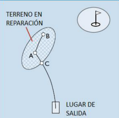 25-1c/3 Bola jugada en Terreno en Reparación se pierde en la misma zona P En la ilustración de abajo, el golpe de salida de un jugador va a reposar en el punto A en una zona extensa de terreno en reparación. El jugador da un golpe a su bola desde el terreno en reparación y la avanza hasta el punto B, que todavía está dentro del terreno en reparación y la bola nunca cruza los límites externos del terreno en reparación. La bola no se encuentra. ¿Cuál es la decisión? R El jugador puede dropar una bola fuera del terreno en reparación, sin penalización, conforme a la Regla 25-1c y dar su tercer golpe. En este caso el punto de referencia es donde la bola cruzó por última vez los límites externos del terreno en reparación con el golpe de salida del jugador (punto C) Alternativamente, el jugador puede, con la penalización de un golpe, dropar una bola dentro del terreno en reparación lo más cerca posible del lugar desde donde jugó por última vez la bola original (Punto A) (Regla 27-1) y jugará su cuarto golpe. Habiendo dropado una bola bajo la Regla 27-1, si el jugador después tiene interferencia por el terreno en reparación, puede tomar alivio bajo la Regla 25-1b sin más penalización.